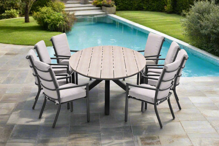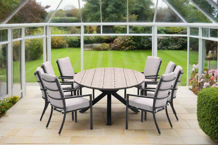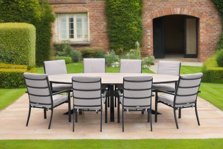 Edison Natural - Eight Seater Oval Dining Suite with Sergio Chairs - Sand Cushions